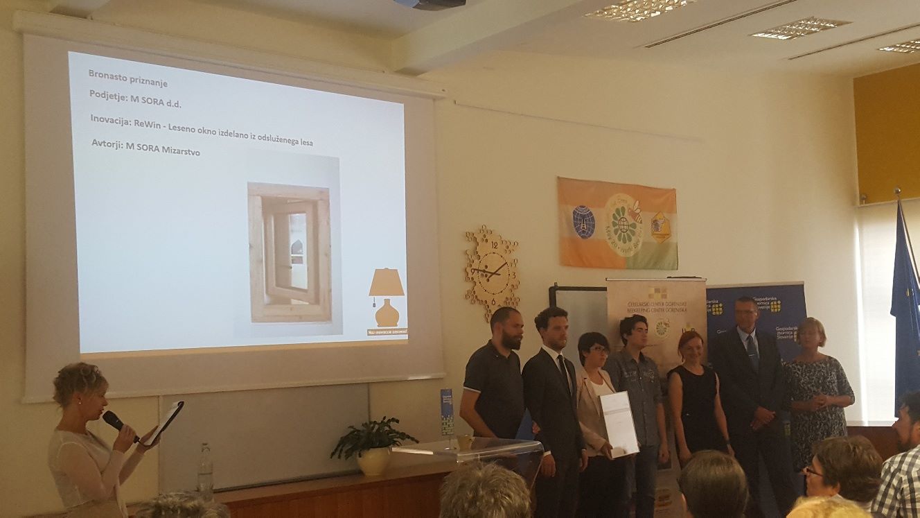On Thursday, 31 May 2018, the day of innovation with the award ceremony for the best innovators of Gorenjska region took place in Lesce, Slovenia and was organised by Chamber of Commerce and Industry Slovenia. M SORA received a bronze award and special commendation for the challenge of the circular economy for innovation window made of recovered wood.