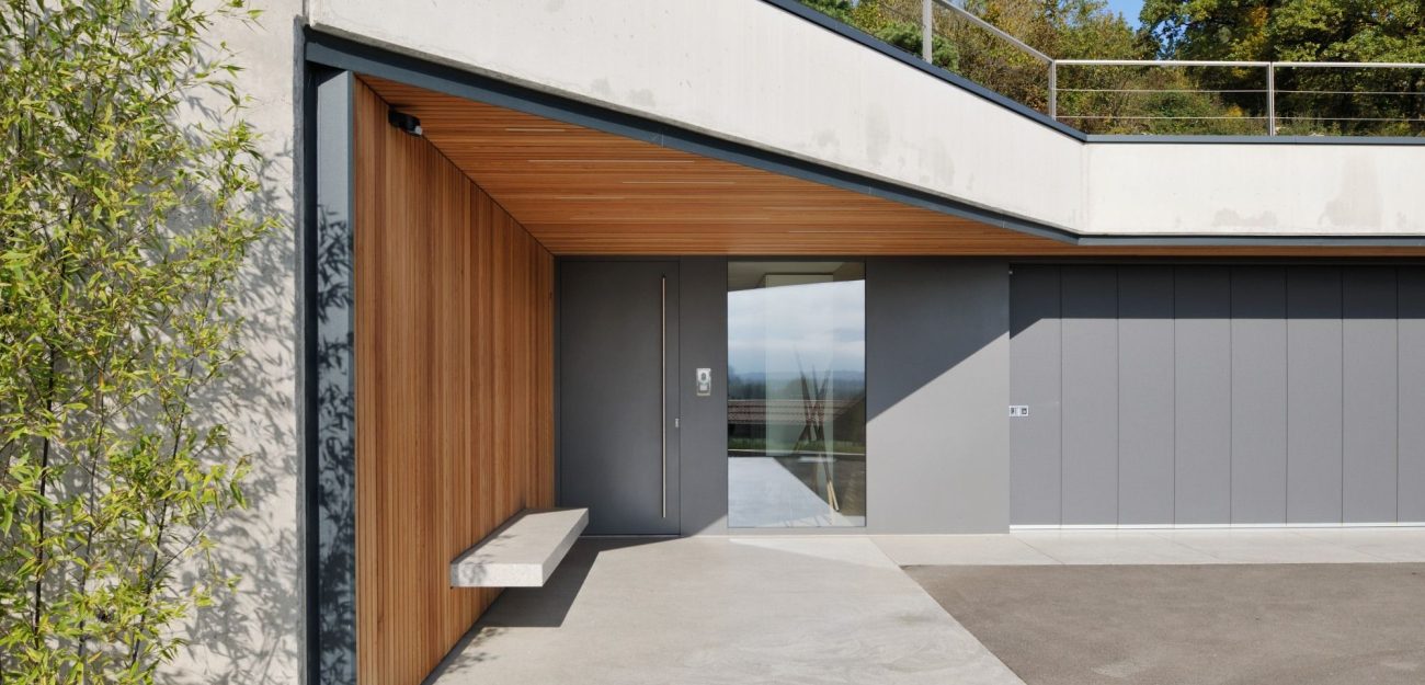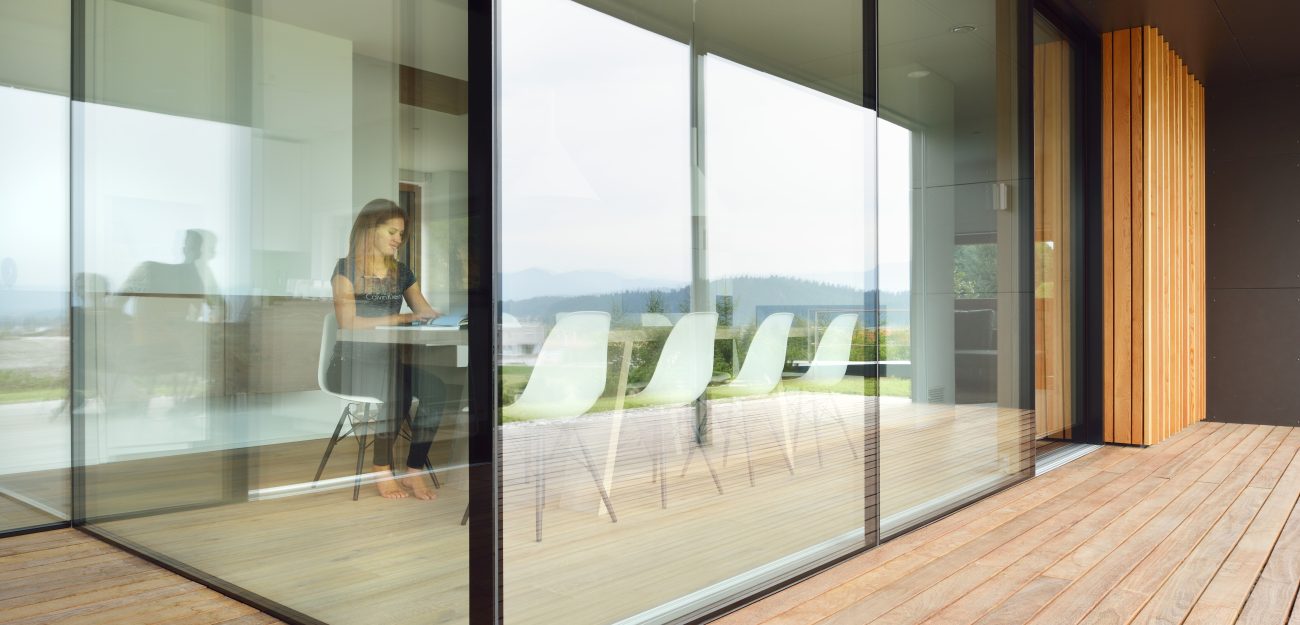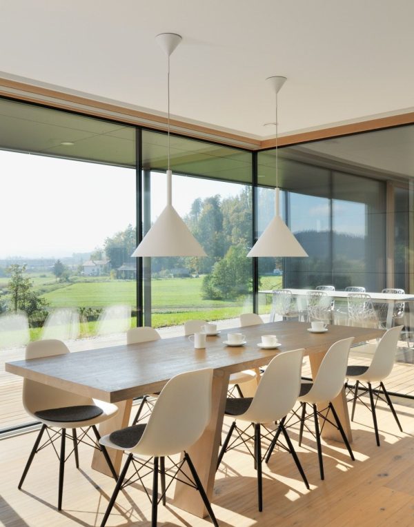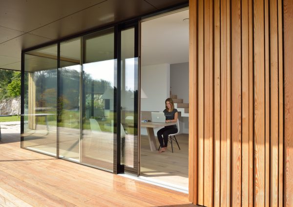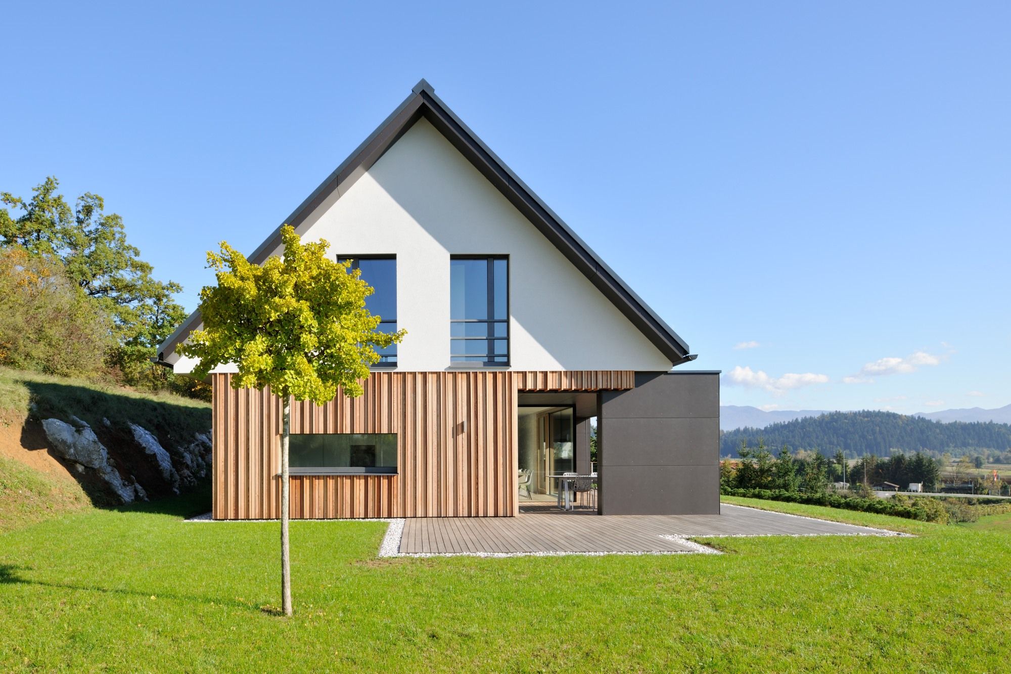 Skewering a steep southern hillside, the house offers a view on the Ljubljana Marsh. The terrain required designing of two external platforms. The lower one consists of a driveway and the main entrance into the house.