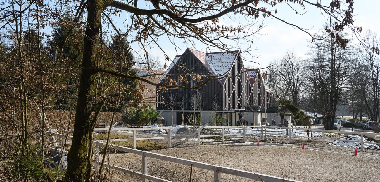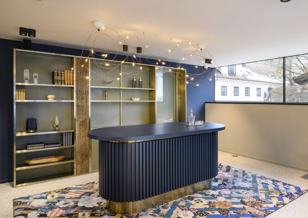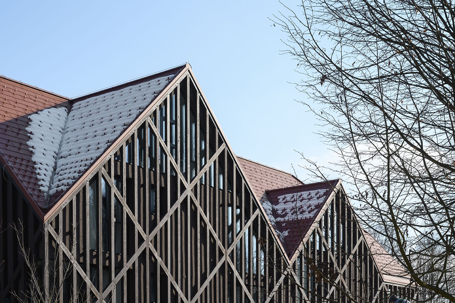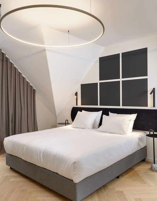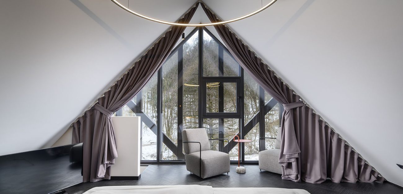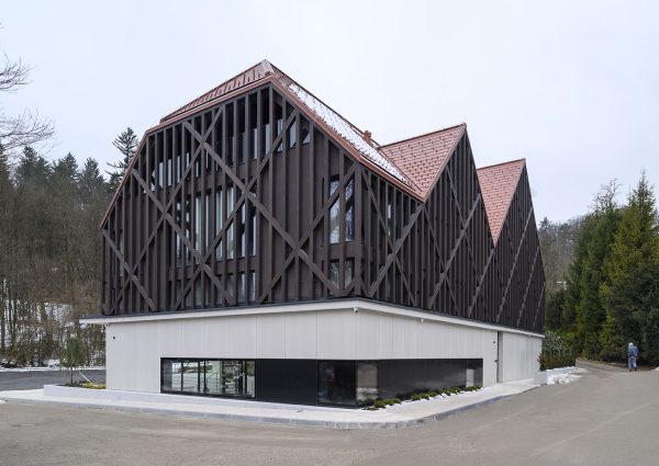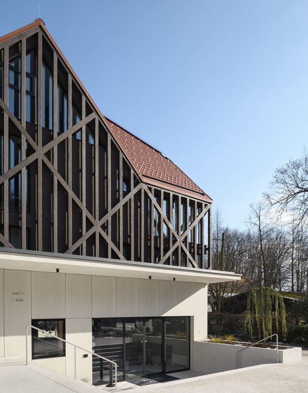 The hotel has been designed in such a manner to make the most of its admissible dimensions. A split-level design and well-thought-out floor plans made it possible to arrange for 18 hotel rooms of which two suites with a loggia and two self-catering apartments with a loggia in the attic. Service rooms are in the basement, while on the ground floor, which is public, there are a semi-underground reception desk and a café with a garden. The canopy of the surrounding trees and the visible wooden construction elements of the villas in the Rožna Valley were the inspiration for the design of the siding. (Photo: Miran Kambič)