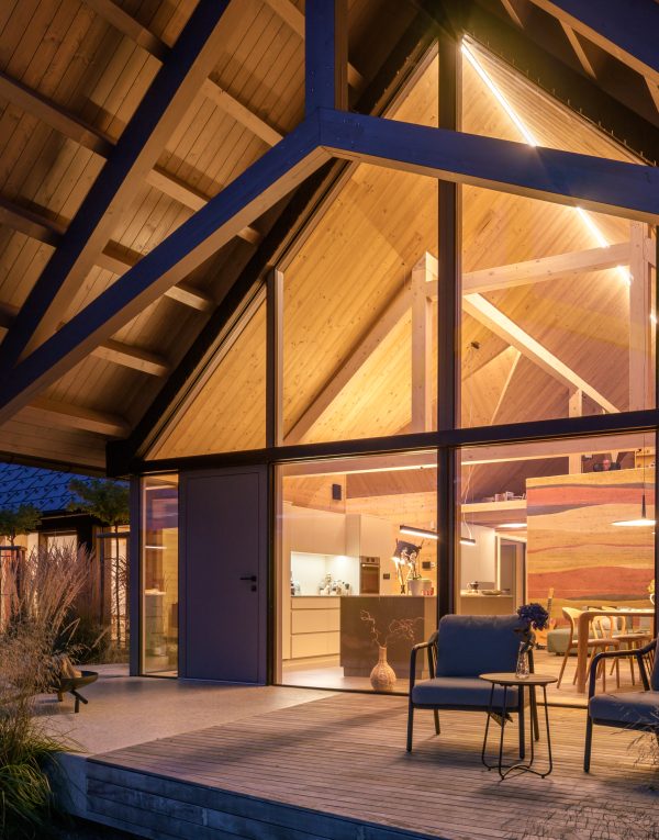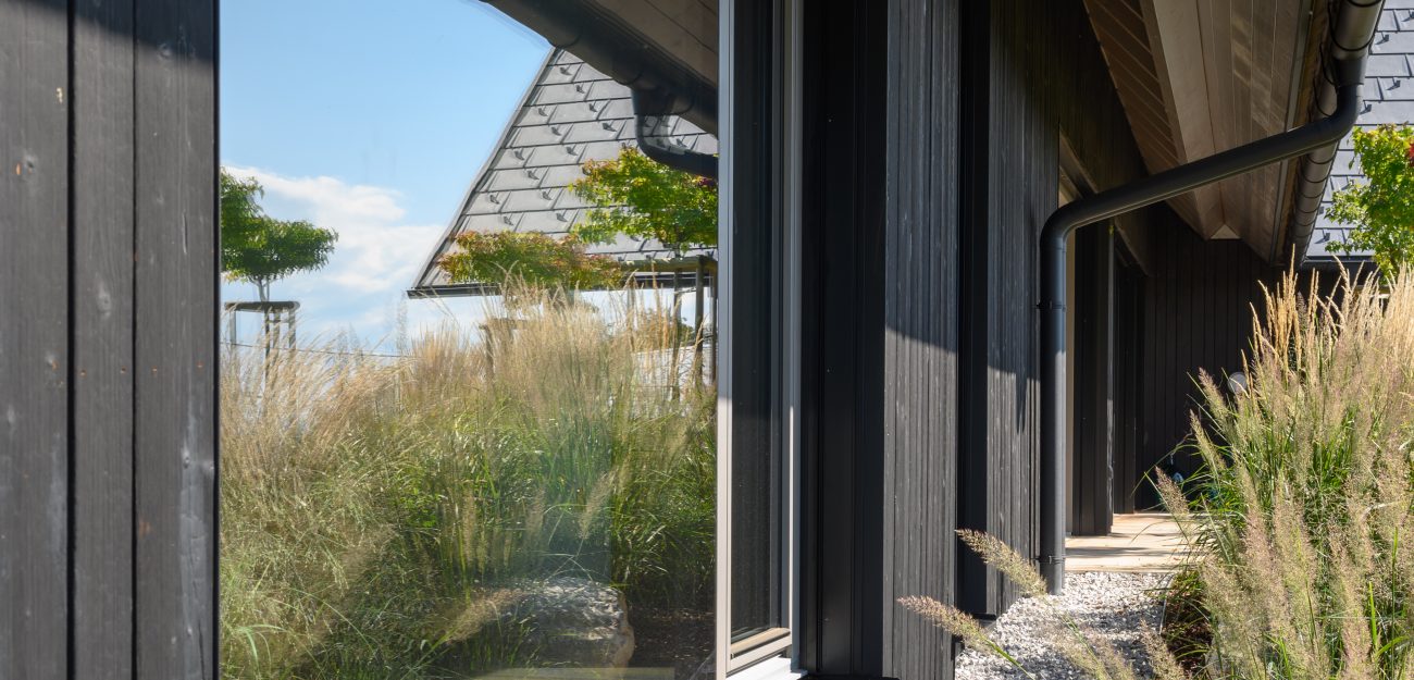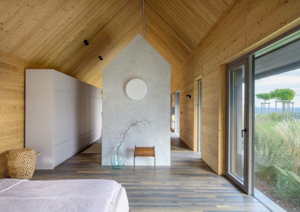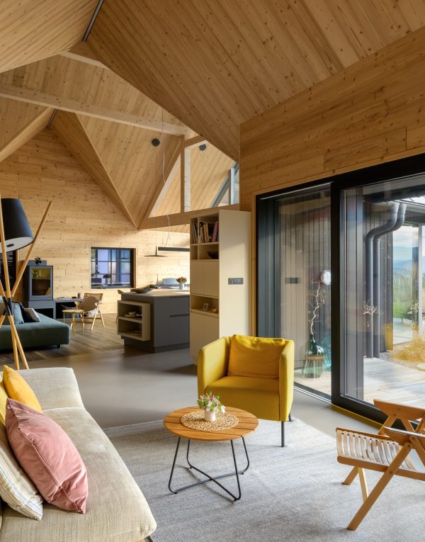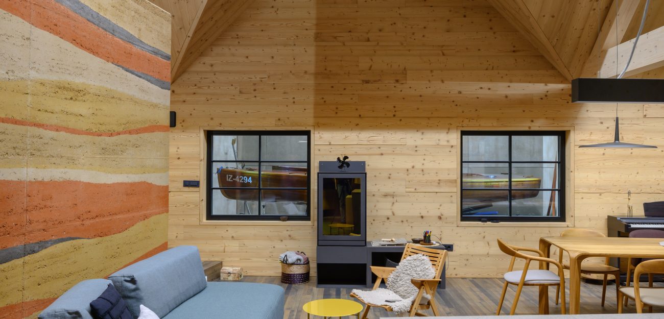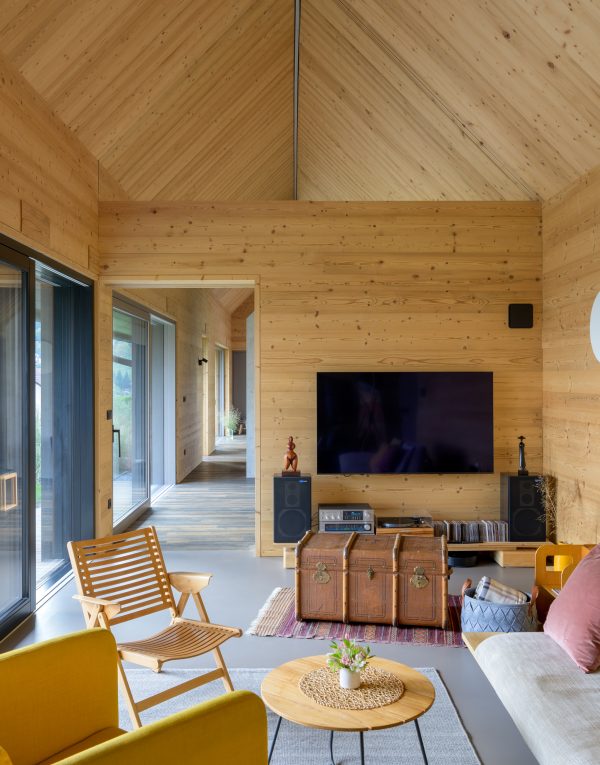 A private home on the outskirts of Ivančna Gorica blends contemporary architecture with nature. Two volumes are joined by a semi‑open zone, while generous glazing frames views of the Stična Monastery and floods the interior with daylight. The result is a bright, open feel and a strong connection to the outdoors. A Shou Sugi Ban façade, wood‑lined interiors and a colourful rammed‑earth feature wall complete a playful yet highly functional concept tailored to an active lifestyle.
