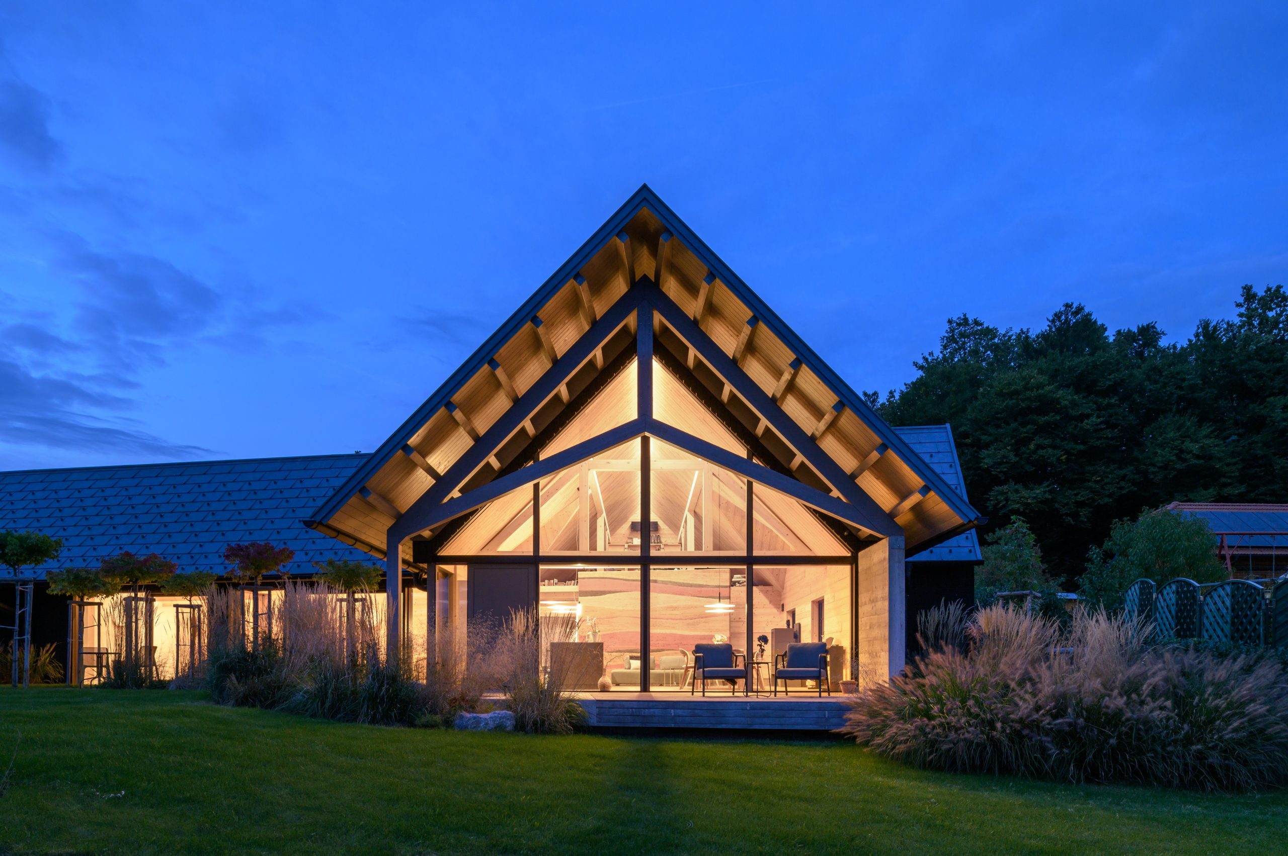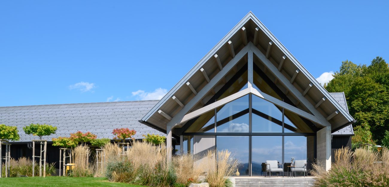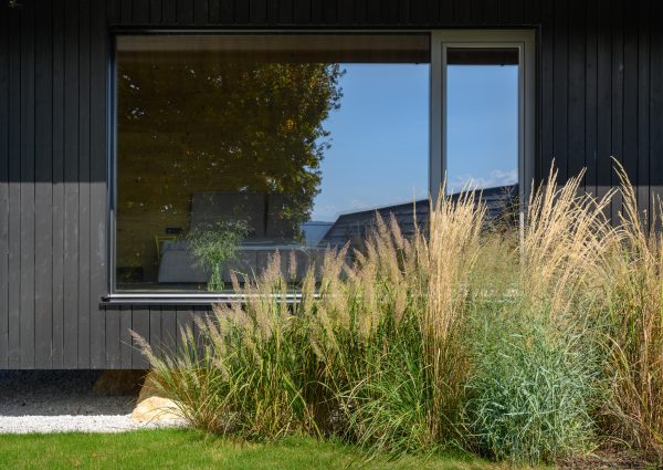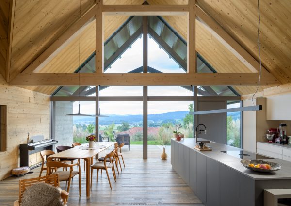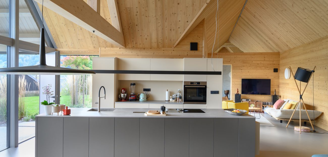 A private home on the outskirts of Ivančna Gorica blends contemporary architecture with nature. Two volumes are joined by a semi‑open zone, while generous glazing frames views of the Stična Monastery and floods the interior with daylight. The result is a bright, open feel and a strong connection to the outdoors. A Shou Sugi Ban façade, wood‑lined interiors and a colourful rammed‑earth feature wall complete a playful yet highly functional concept tailored to an active lifestyle.